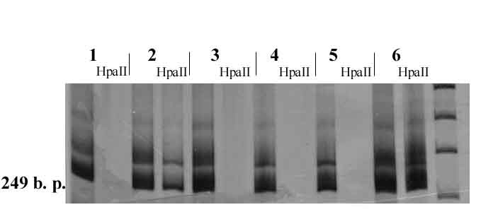 HpaII (CCGG) либо HhaI (GCGC). При подборе олигонуклеотидных праймеров ПЦР учитывалось наличие внутренних сайтов узнавания для этих рестриктаз в амплифицируемом участке. Праймеры подбирались таким образом, что амплифицируемый фрагмент должен содержать не менее 3-4 сайтов узнавания для HpaII и HhaI. В случае метилирования промоторной области, гидролиз ДНК не происходит и продукт ПЦР может быть выявлен в геле. При отсутствии метилирования происходит полный гидролиз ДНК, и продукт ПЦР не выявляется в геле. Для оценки полноты гидролиза ДНК проводилась метил-чувствительная ПЦР промоторной область других генов, для которых показано отсутствие метилирования.Для исследования было взято: 7 образцов нефробластомы, 8 образцов тиреокарциномы, 8 образцов лимфоцитарной массы при хроническом лимфолейкозе, 8 образцов саркомы Юинга, 5 образцов хондросаркомы, 2 образца рака предстательной железы, 10 образцов рака молочной железы, 18 образцов меланомы, 50 образцов ретинобластомы + 26 образцов ДНК лимфоцитов больных ретинобластомой, чей опухолевый материал недоступен. Также в качестве контроля были взяты нормальные ткани: 10 образцов ДНК лимфоцитов крови, по два образца нормальной ткани почки, щитовидной железы, молочной железы и 5 образцов нормальной ткани предстательной железы.