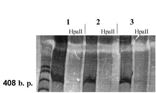 Отсутствие сигнала амплификации, проведенной на гидролизованной ДНК этих же образцов с использованием праймеров на CG-богатые промоторные области других генов (Rb1, p16/CDKN2A, Ing1-1a, Ing1-1b и Leu5) указывает на то, что положительный сигнал амплификации является следствием неполного гидролиза на выбранном участке ДНК в результате метилирования этого района. При этом амплификация гидролизованной ДНК имеет ту же интенсивность, что и ПЦР нативной ДНК, и это может свидетельствовать о том, что метилирование CG-динуклеотидов 2-го экзона этого гена проходит во всех клетках и, возможно, на обеих гомологичных хромосомах. По данным литературы дистальней