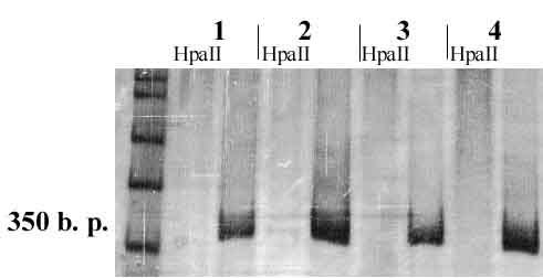 Рисунок 15. Анализ метилирования CpG-островка гена Leu5 в образцах: 1- лимфоциты, 2 – лимфоциты при хроническом лимфолейкозе, 3- саркома Юинга, 4- рак груди. Электрофорез в 8% ПААГ.